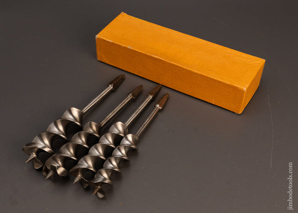 A complete graduated set of 13 bits. All marked RUSSELL JENNINGS. All are bright, clean and sharp. Sizes 4 through 16 which correspond to 1/4 inch to 1 inch. The bits were patented in 1855. The three-tiered box was patented in 1890. They were bought out by STANLEY in 1944. The best user auger bits ever made!